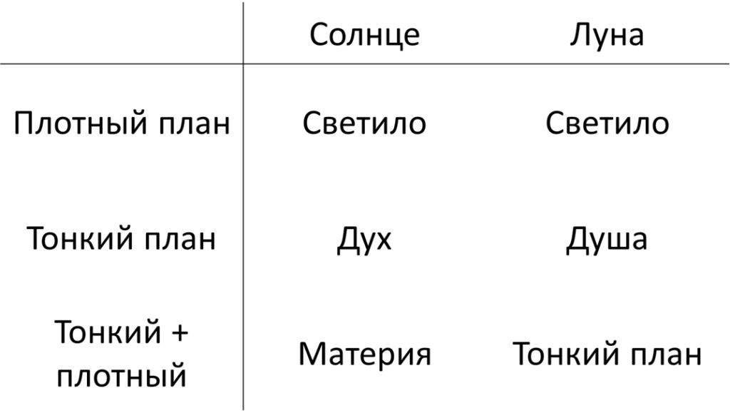 - Солнце и Луна как проявленный (плотный, материальный) мир и непроявленный (тонкий).