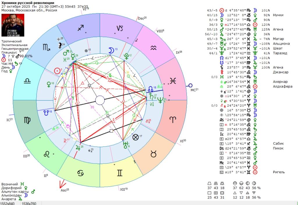 Режиссёр Андрон Кончаловский 3 года снимал сериал «Хроники русской революции» и 27.10.2025 года в 21:30 по Москве была премьера на 2-му каналу ТВ. Не буду судить о сериале, отмечу лишь восходящий экзальтированный Юпитер, а на дату 08.11.1917 он был в верхней кульминации в позиции изгнания в Близнецах. Юпитер – это закон, власть и авторитеты. А когда спускали флаг СССР от 25.12.1991, Юпитер тоже был на восходе (в Деве – изгнание). Не исключаю, что это просто совпадение.