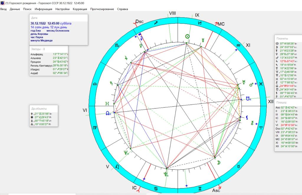 С временем включения гороскопа СССР можно подискутировать, например Безбородный ставит время 23 часа. Экзальтированный Сатурн на время 12:45 держит, как идеологию, так и верховную власть. В разворотах он несёт информацию радикса.