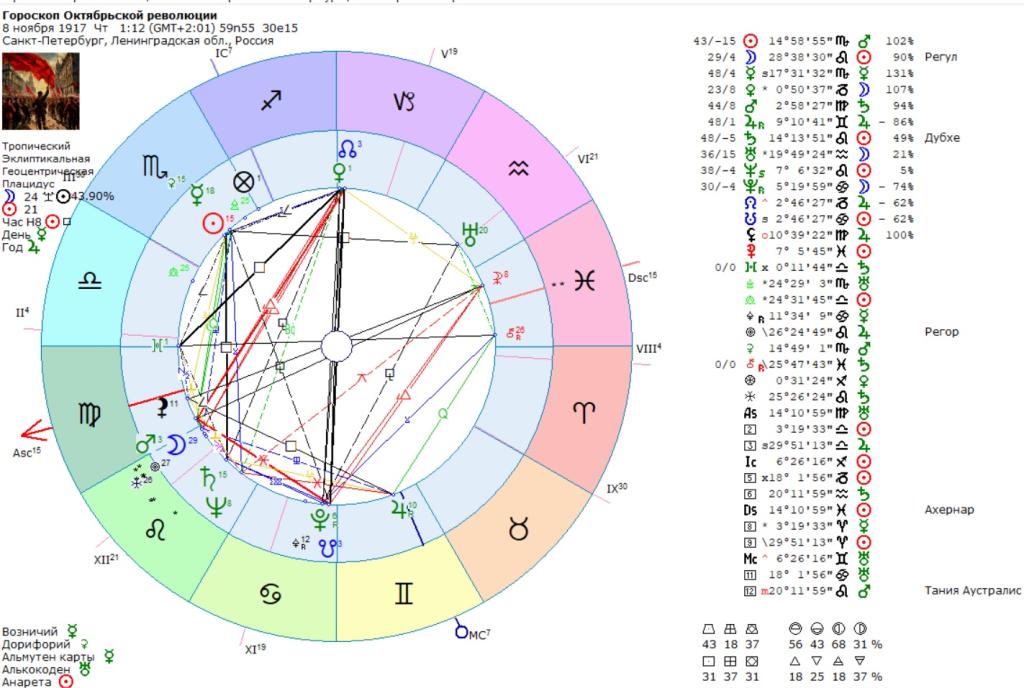 С гороскопом Октябрьской революции была постоянная путаница в связи с тем, что было 2 перевода времени. Летом 1917 года Временное правительство в подражании Европе перешла на летнее время и сдвинула часы, а в декабре Ленин вернул нормальное время.