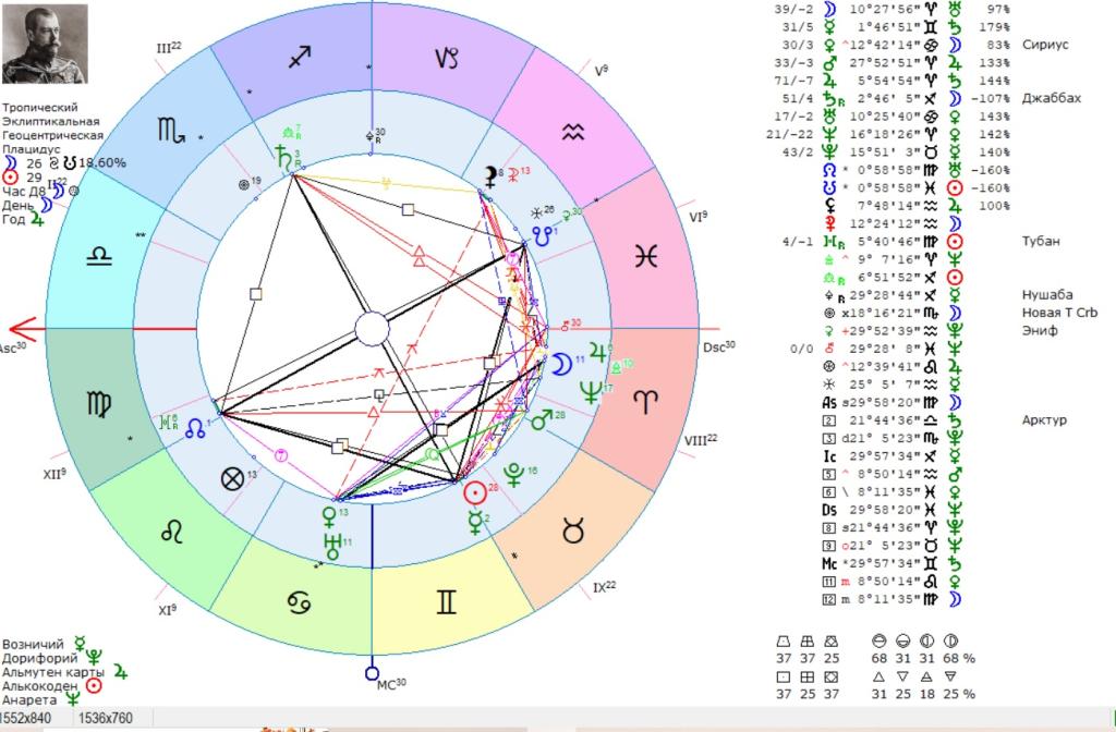 То, что судьба его фатальна, не вызывает сомнений – конфигурация «Большой крест» на узлах. Противостояние Солнца и Сатурна, хоть и не на вертикальной оси, но Сатурн правит Надиром, а Солнце в соединении с Меркурием, что правит Зенитом – падение с трона при ошибках НЕИЗБЕЖНО. Кроме того были знаки при его коронации: на Ходынском поле насмерть было задавлено множество людей – очень дурной знак.