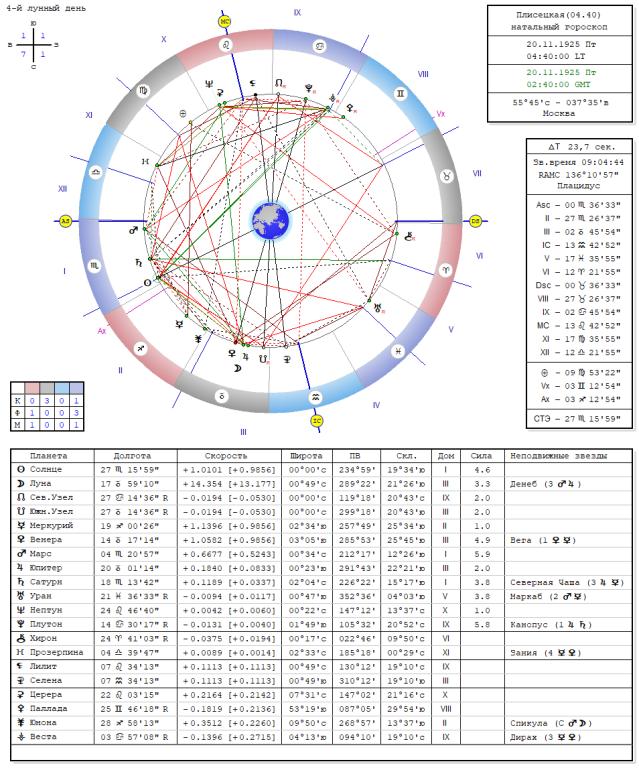 А информация о времени рождения если и была у МАйи от мамы то очень давно и скорее всего в форме - "родилась ночью", тк раньше мало кто обращал внимание на конкретное время рождения. Вот астролог и взял за точку отсчета Полночь и от него сдвинул всего на 20 мин по своему видению ее гороскопа. В моем варианте она родилась в 4-40 ночи (при восходе в этот день в МСК в 9-м часу утра) т.е это еще глубокая ночь и отличается от предложенного Лесё на 4 ч.