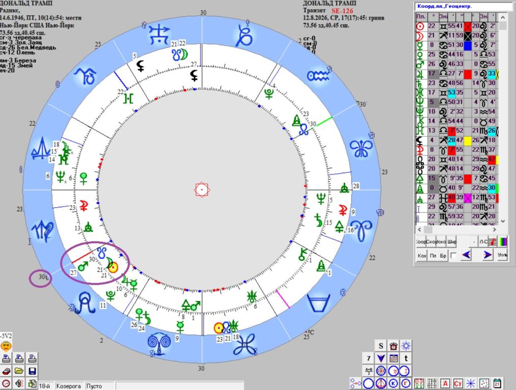 Что касаемо Гренландии: час «Х» настанет в августе 2026 года, решится судьба самого большого острова на нашей планете. Ближайшее полное затмение сериала SE-126 будет 12 августа 2026 года. Полоса полной фазы пройдёт через Арктику, Гренландию (!), Исландию и северную Испанию. Само затмение будет в 21-м Льва, Кету=30 Льва, т.е. восходящий Марс Трампа попадает в этот раствор и силовой способ разрешения проблемы вполне реален.