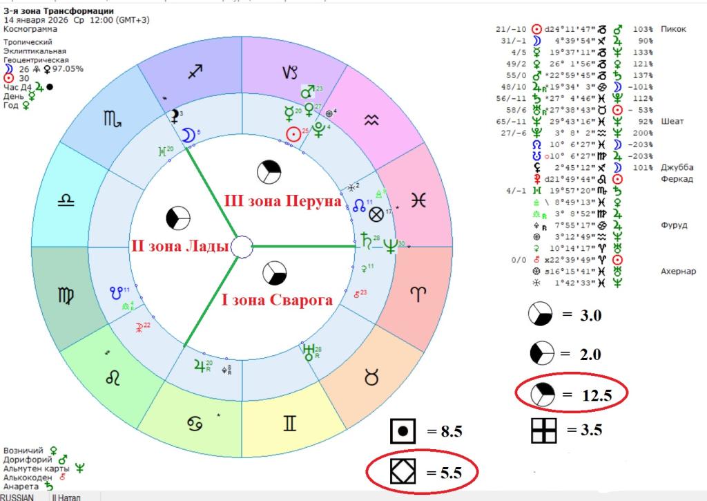 Если взглянуть на сегодняшнюю транзитную констелляцию от 14.01.2026 г., то очевидна доминация III зоны трансформации. Кто родился в этот день, его высшей программой будет программа III зоны и козерожий миф про Пана, а также о спуске Геракла с Олимпа в ад, освобождение томящегося там Прометея, человеку прописан на всю оставшуюся жизнь.