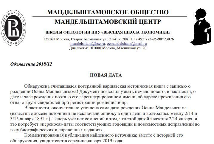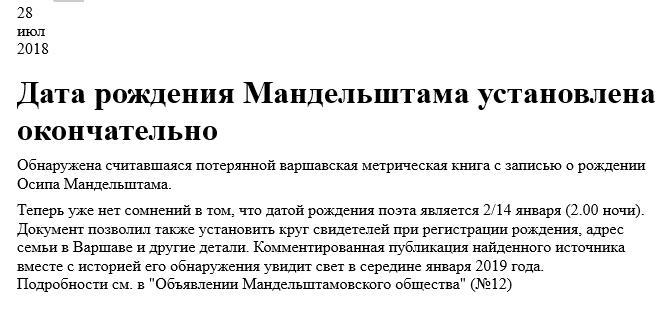 В день смерти поэта астероид Мандельштам встал в точный (4 мин) квадрат) к Солнцу поэта и напротив (1 мин) астероида Мемория (вечная память). Астероид Варшавия (место его рождения) совпал с тр. Солнцем его смерти, тем по-козероговски завершив географический круг жизни на Земле.