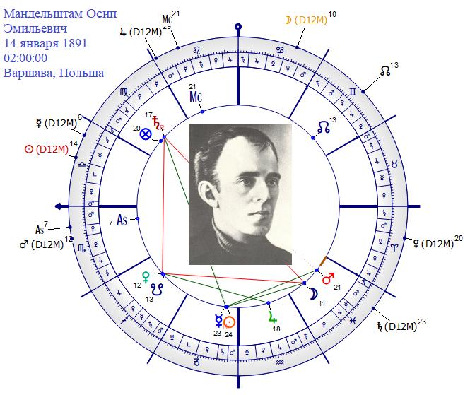 Асцендент у Мандельштама в знаке Скорпиона (по версии Б. Израителя), хотя дата выставлена не 14, а 15 января, так как в записях самого поэта указано, что родился в ночь со 2 на 3 янв., что по новому стилю соответствует с 14 на 15 янв.1891 г.