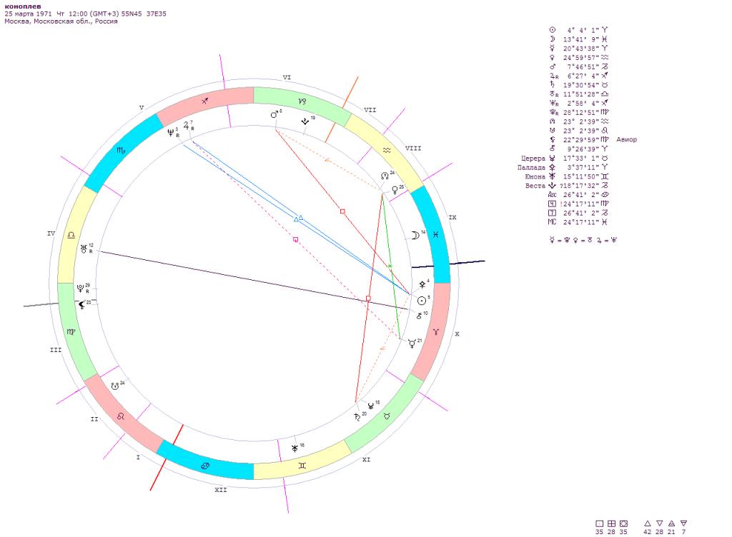 Все это указывает на то, что врачу полезно знать астрологию. Если б врач знал, что перед ним Овен с квадратом на Марс, то он бы излишнюю агрессию, что порой вспыхивала у Коноплева не отнес бы к псих.ненормальности, а воспринял как черту его зодиакальной характеристики.