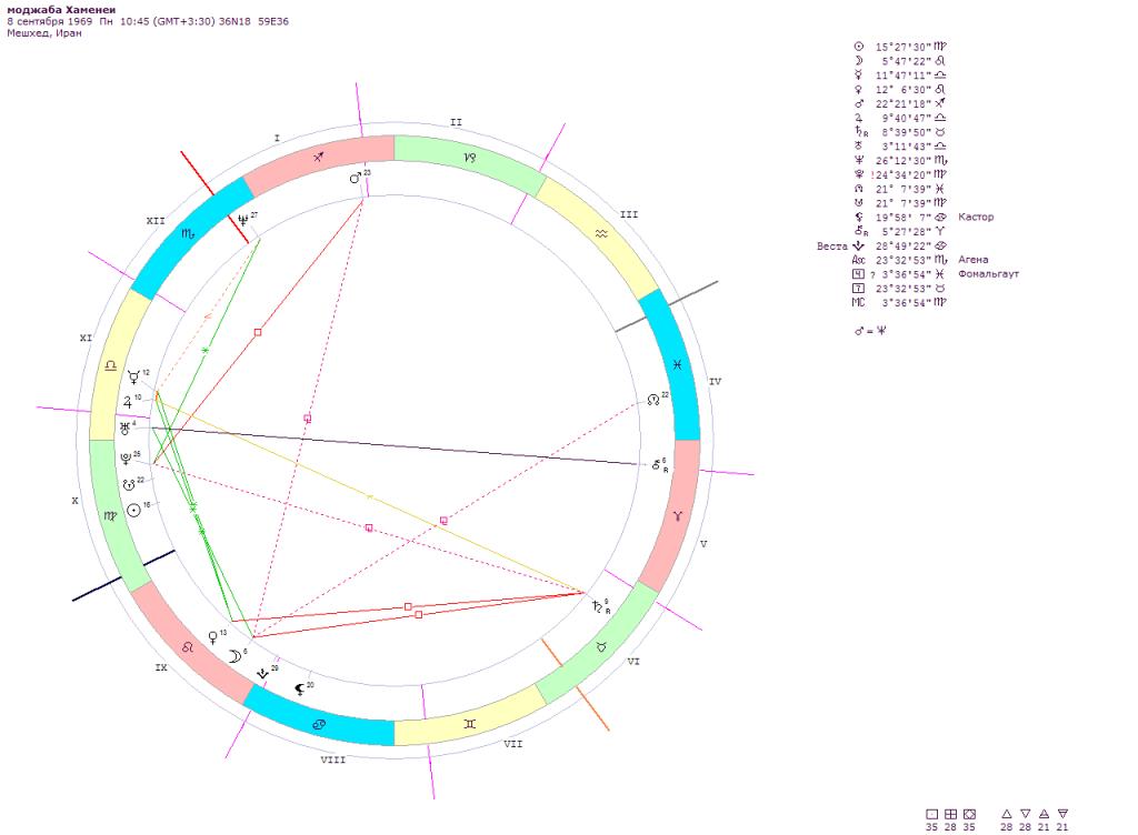 Также важно, что ВУ (ориентир) Ирана на Солнце нового .Хаменеи и в точном (орб 22 мин) тригоне его Сатурна с Сатурном Ирана, т.е. гармония его принципов с принципами и нац.стержнем своей страны. Но квадрат Марс-Плутон нового Хаменеи в тау-квадрате к Марсу Ирана, и его Юпитер против Солнца Ирана – показывает, что это лидер страны именно в войну, но не в мирное время, стимулирующий прежде всего к борьбе, а не в мирных планах на перспективу.