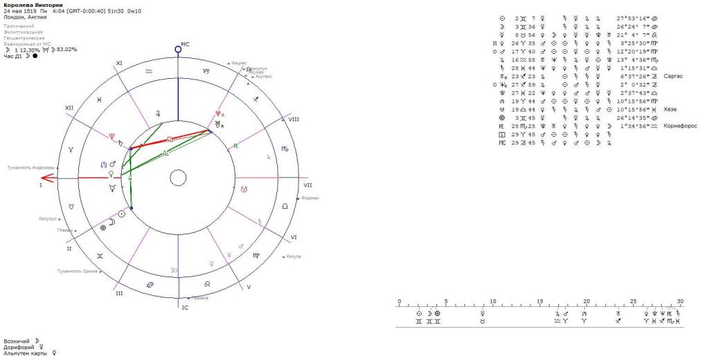 3. Свита Луны: Луна в Близнецах. Согласно эфемеридам на 24 мая 1819 года, Венера располагалась в конце Овна (26°35'), а Марс — в середине Овна (17°40').