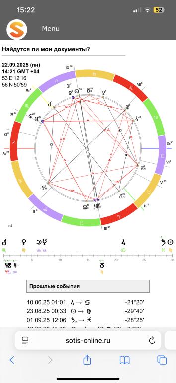 Дорогие астрологи, помогите с хораром. Документы были отправлены курьером в другой город, где потерялись. Служба уверяет, что курьер не дозвонился, положил их в ящик, якобы передал. А получатель говорит, что никаких документов не получил, ни звонка не было/ни в ящике ничего нет. Документы важные, срочные. Найдутся ли они теперь? Вопрос задан мной ( документы мои) 22.09.2025 г. Ижевск в 14.21 по местному времени ( GMT +4). Карту прилагаю. Обратную связь дам, в любом случае.