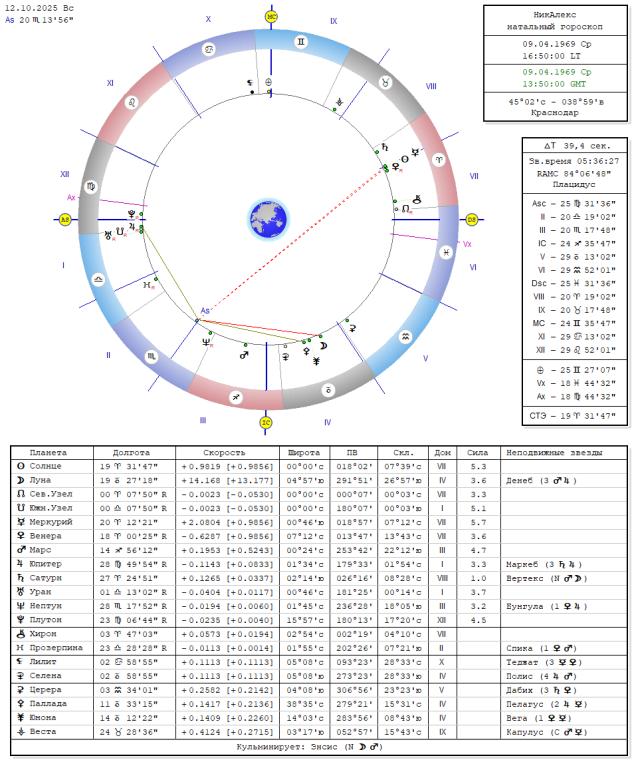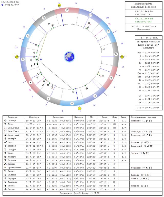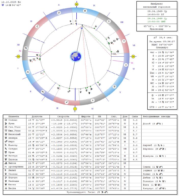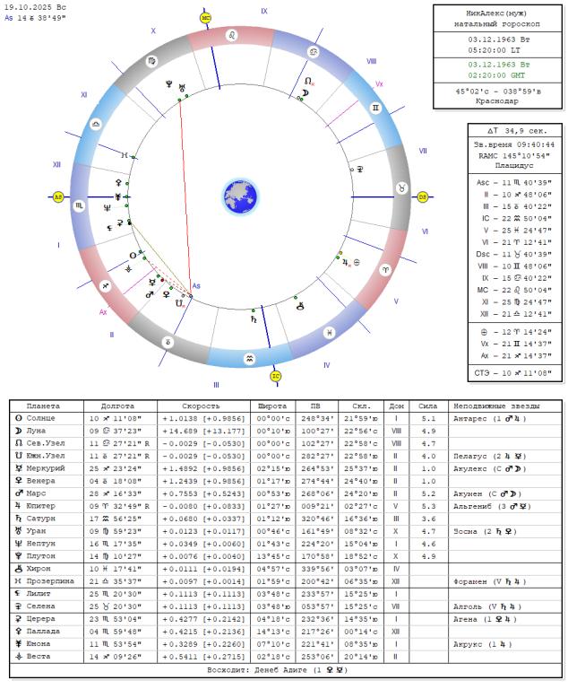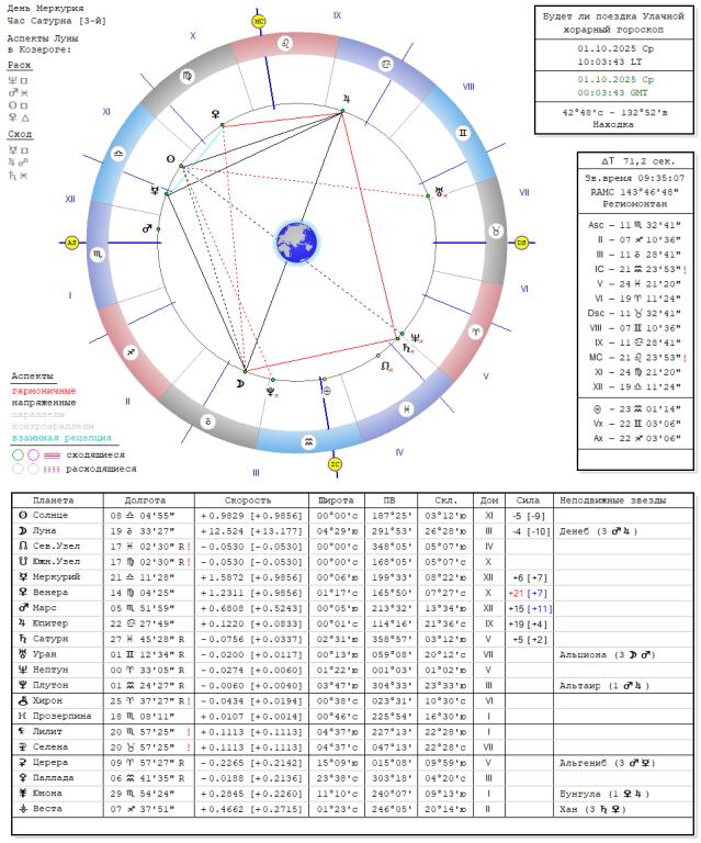 Будет ли поездка Удачной Хорарный вопрос задан 01.10.2025. г. Находка, приморский, время задания вопроса 10.03 Первый этап Для того чтобы ответить на этот вопрос на первом этапе определить необходимо определить радикален ли вопрос. Смотрим в каком доме стоит Луна и определяем соответствует ли её положение теме вопроса. Луна стоит в 3 дому, следовательно натив думает о поездке. Ответ ДА. Хорар радикален Второй этап Определяем сигнификаторы вопроса. Поездка на расстояние 2000 км это далеко, но так как вы туда часто ездите то для вас это привычное дело. Так как вы спрашиваете о поездке то за поездку отвечает 3, 9 или 12 дом. Обычно положение Луны, если хорар радикален, указывает на дом, который сигнифицирует вопрос. Ход дела Луна находится в оппозиции с Юпитером, это значит есть какие-то причины противодействующие поездке. Юпитер управитель 2 дома. Какие это причины кроме того что сыну приснился не хороший сон.Юпитер стоит в 9 доме, а это дом внуков. Может здоровье внуков вас остановит или вернет с дороги назад Следовательно мы должны смотреть Сатурн, Сатурн стоит в знаке Рыб, но Сатурн ретрограден. Весьма вероятно что придется вернуться домов. Здесь возникает вопрос, почему поездка сигнифицируется Сатурном, может хорар таким образом показывает техническое состояние машины. Почему Сатурн стоит в знаке Рыб, может дорога будет не проходима из-за погоды. Здоровье собаки так же может быть причиной возвращения. Собака сигнифицируется 6 домов, следовательно сигнификатором собаки является Марс. Марс стоит в знаке Скорпиона в 12 доме, при этом К1Д так же стоит в знаке Скорпиона. Мжно предположить что ваша собака может исчезнуть. Хотелось бы услышать ваши комментарии по этим вопросам… Анализируя положение Меркурия управителя 8 дома , но находится в квадрате к оппозиции к Луне-180-Юпитер и пока мы не выясним, кто такой Юпитер нам сложно будет сказать, как пройдет поездка Кроме того мы видим что Солнце У10Д так же аспектирует напряженными аспектами Луну-180-Юпитер, а это возможно какие-то напряженные ситуации связанные с работой