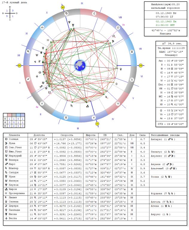 Рис.1. Гороскоп мужа НикАлекс со ВР05.20 Прежде всего мы должны обратить внимание что К1Д и К7Д стоят на границе знаков.Граница знаков это интервал 3 градуса, то есть с 28 по 30 градус Скорпиона и с 1 до 3 градус Стрельца. Это означает что оба знака формируют характеристики натива и что управителями натива являются четыре планеты, Плутон, Марс, Юпитер и Нептун При этом в знаке Скорпиона стоят два куспида, К1Д и К12Д. Есть желание поставить К1Д точно на границу знаков, для этого в биографии есть причины. Кроме того в таком же положении находятся К4Д и К10Д. Следует обратить внимание что у меня 4 дом отвечает за отца, а 10 дом отвечает за мать. При этом мы видим что в оппозиция Уран-Хирон стоит в 4/10 домах. Любую оппозицию 4/10 можно трактовать как потенциальная символика для развода. Следовательно дирекционное соединении К10Д с Ураном которое в гороскопе со ВР05.20 соединяется в 29.021971 можно интерпретировать как развод, и далее соединение дирекционного К10Д с Плутоном(30.03.1976) как событие Мама соединилась с сыном(Плутон, У1Д). Это при условии что дата когда мама забрала сына к себе 1976. Кроме этого мы видим что К7Д стоит в 01.38 Близнецов, что а К8Д в знаке Рака. Весьма вероятно что знак Близнецов имеет характеристики так же 8 дома, переломы, травмы, аварии в дороге. Меркурий стоит в 1 доме, однако это так же относится к его партнерам. Кроме того из биографии мы знаем что его первая жена умерла. В этой карте мы видим что Меркурий имеет сентагон с Плутоном, опасность для жизни. Кроме этого положение К7Д и К7Д в знаке Близнецов формирует взаимодействие элементов 7/8, а это опасность для партнеров. Оппозиция Уран-Хирон кроме как кризис по теме домов, она еще может влиять на другие дома. В нашем случае если поставить ВР05.16 будет точный аспект с К7Д. Вывод Гороскоп со ВР05.20 при наличии существующих биографических данных не требует корректив. Однако первый вопрос который я задал НикАлекс, как астролог определил в какой части суток находится время рождения.Я решил тоже попытаться это сделать...