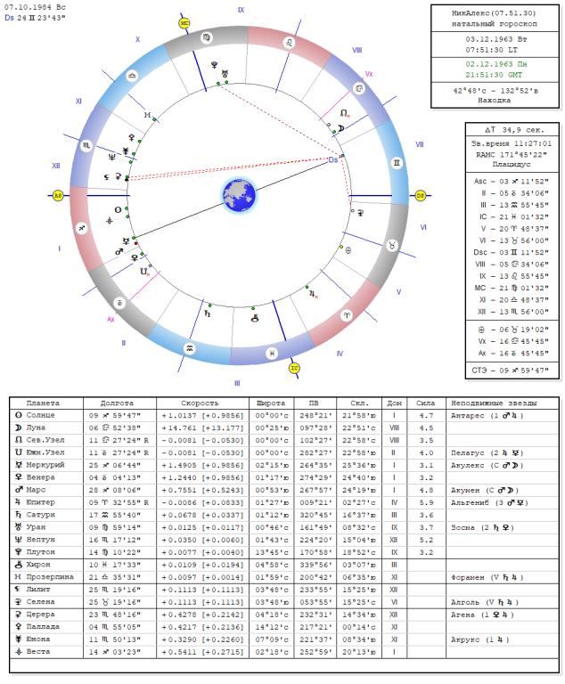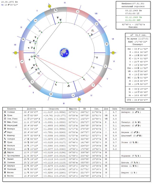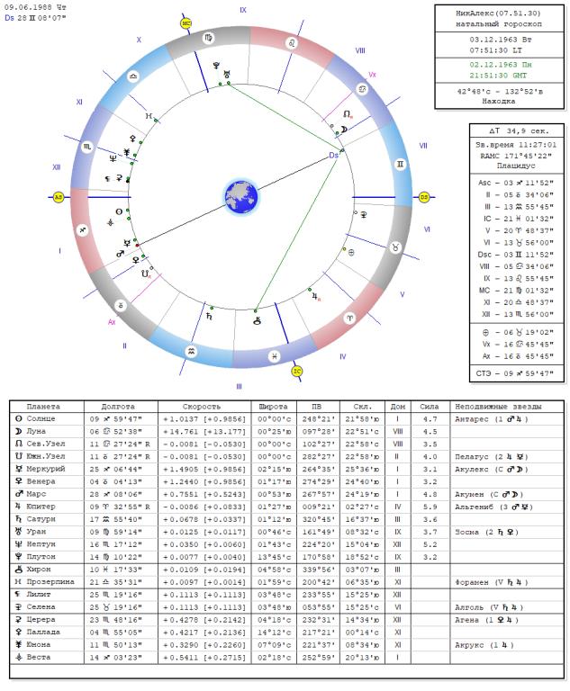 Завершение процесса ректификации После корректировки места рождения и доработки ректификации было установлены новые данные гороскопа мужа НикАлекс 03.12.1963, г. Находка Приморского края ВР.07.51.30, асц.03.11. Стрельца