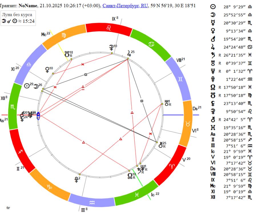 Всем здравствуйте) Вопрос об отношениях с мужчиной , с которым недавно познакомились, как-то не смогла определиться с конкретным вопросом, в голове крутилось и как относится, и что будет дальше, и напишет ли). Хорарная карта показалась оч знакомой, оказалось, задала вопрос прямо в лунар. Не знаю, как насчет мистики и знаков судьбы, но по-моему прикольно, что-то это может значить?) Буду благодарна всем ответившим, надеюсь быстро дать ОС) Почему-то не могу вставить ссылку на карту, вставляется с текущем временем. Извините, прикреплю картинку. Время вопроса : 21.10.25, !0:26:17, СПБ