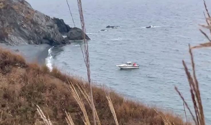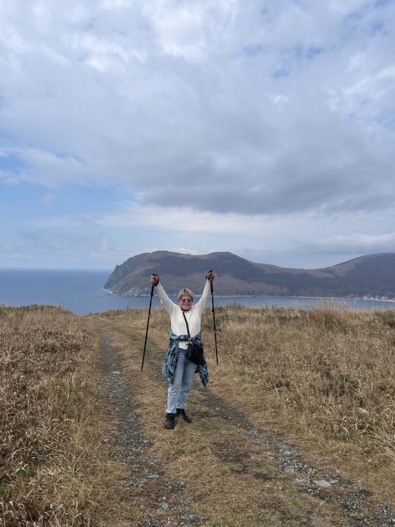 почему примерно? в походах всегда всех пересчитывают.. эта путешествие не хухры-мухры вдоль по Питерской.. учитывается погода (при выходе из Находки моросило, иногда дождик заливал очки), высота волны - для этого катера 0,6 м максимально.. было холодно, но мы все укутались.. проблемой было удержаться в катере (бросало на волне прилично) и не уронить айфон в море.. рулевой, гид Е, семья из 4 человек из Находки, "бывалая" Н из Находки и я.. в общем, всё организовано было классно! и гид Е, и "бывалая" мне очень помогали - обе в горы ходят.. поднимались сначала вместе.. но я в заданном темпе физически не могла идти.. и гид Е перепоручила меня "бывалой" и дала рацию.. мы с Н периодически догоняли основную группу, пока они лазали по батарее, фотались у пушек.. дошли до обрыва над маяком - зрелище вау! а Н хотелось сбегать к часовне на противоположную сторону.. обратный путь - хорошая широкая дорога по хребту - иди да иди.. вот здесь была первая ошибка - Н. была участницей похода и должна была доложить старшей о желании изменить маршрут.. Е, скорей всего, ей бы не разрешила.. но мы об этом не подумали и двинули по верхней дороге обратно.. от рации я отказалась - руки заняты палками.. телефоны перепроверили - связи не было.. ну и пошли каждая в своём темпе обратно, договорившись, что встретимся на этой дороге.. группа осталась лазать по подземным сооружениям.. а я шла-шла по дороге.. увлеклась съёмками видов сверху, дышала этим пьянящим воздухом и думала, что здорово бы этот аромат в духи впечатать.. или мужскую туалетную воду - афродизиак реально!) в итого дошла до конца этой дороги и поворота влево, а мне надо было вправо вниз.. а Н. всё нет.. вижу джип едет в мою сторону на этот поворот.. тормознула и спросила дорогу.. народ реально нормально ехал на джипе, а не шёл, в часовню.. глянули в карту и сказали, что я прошла ровно 1000 м от тропы.. пошла обратно.. отсчитала эту 1000 м - тут меня нагнал тот же джип.. сказали, что никакой женщины не встречали.. махнули рукой в сторону тропы - чё-то совсем не видна в высокой траве.. на дороге никого - пора спускаться.. каких-то 100-150м до средней дороги.. по шажочку, упираясь в палки, на руках фактически.. сколько-то прошла и тут зазвонил айфон! в 14:56.. я офигела - не знала, что у меня связь работает - иначе позвонила бы и уточнила тропу.. в итого когда спустилась - руки-ноги ходили ходуном от напряга.. Н. шла мне навстречу и была поражена моим спокойствием.. сказала, что думала я на эмоциях на грудь брошусь.. оказалось, когда основная группа с Е спустилась к берегу - не было нас двух - меня и Н. подумали, что я с ней.. потом спустилась Н.. без меня.. она не нашла меня на дороге и решила, что я спустилась с группой.. вот тут-то они задумались.. и позвонили.. самое интересное, что группа джип видела на дороге, а Н не видела.. видимо, возвращалась по другой дороге.. на берегу подобрала 3 звезды, хотела взять на память.. но Е разложила их на камушке, я сфотала в 16:02.. Е бросила их в море.. забрались на катер и двинули обратно - 38 км.. у 5-ти пальцев Е и Н "поймали" чаек на хлеб-булку и всю дорогу до Находки чайки летели за нами, ловя в воздухе хлеб.. необыкновенное зрелище!