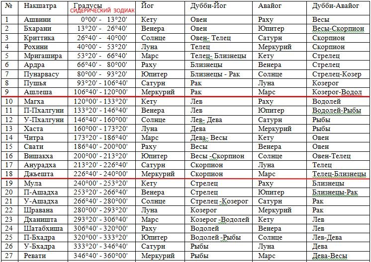 по этой таблице всё верно! смотрим свою строку - №27 Накшатра Ревати - больше никуда не смотрим! Меркурий=Рыбы Марс- Дева-Весы.. выбираем Весы (как подсчитали, прибавив 186*40) - соответственно Венера ------------ есть накшатры, которые расположены в одном знаке (по обоим столбцам Дубби) - №№ 1, 4, 6, 8, 10, 13, 15, 17, 19, 22, 24, 26 (всего 12 из 27), где сходу можно увидеть Дубби - знак -> управитель н/п, №1 Ашвини - Кету-Овен-Раху-Весы = Кету-Марс-Раху-Венера №4 Рохини - Луна-Телец-Меркурий-Скорпион = Луна-Венера-Мерк-Марс