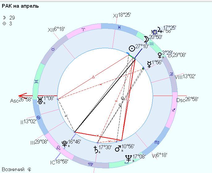 ....Продолжаем делать прогноз для женщины Рака. И я сказал, что на апрель любовь - отменяется. А почему я так сказал? А сейчас увидите. Выставляем планеты на карту...
