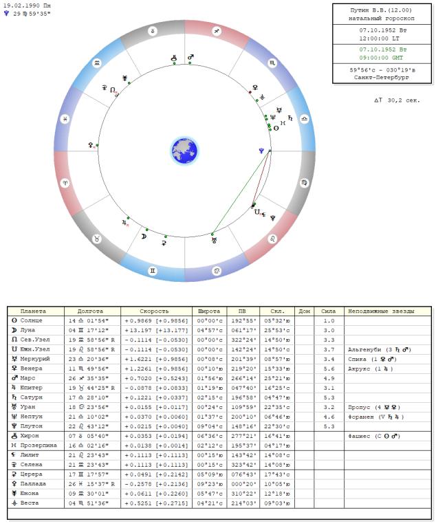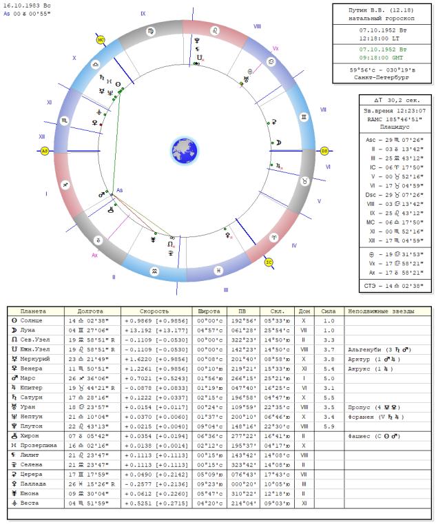 Данные гороскопа Путина В.В. 07.10.1952, г. Санкт Петербург, ВР12.18. асц.29.07. Скорпиона